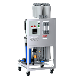Оборудование смонтировано на мобильной платформе, с антивибрационными колесами, для легкой транспортировки по объекту. В комплектацию входит 6 обратноосмотических мембранам типа 4040 в стеклопластиковых корпусах, вертикальный насос, контроллер и датчики для контроля качества воды.